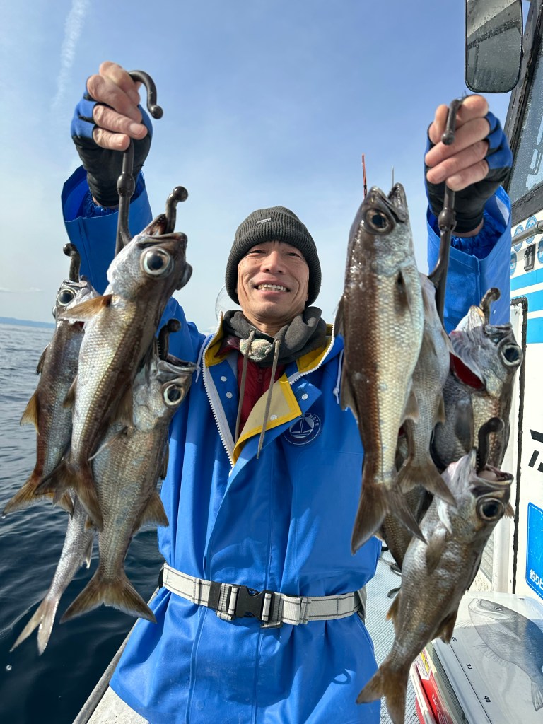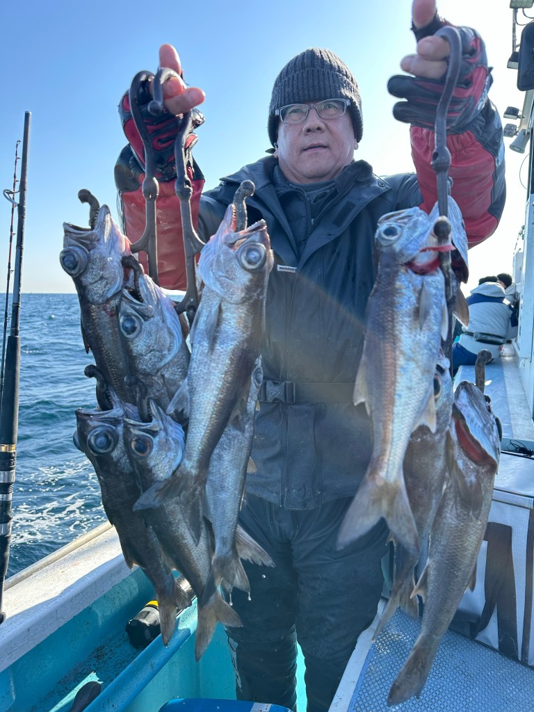 お疲れ様でしたクロムツ良型混じりでポツポツ上がるも潮止まったり流れたりの繰り返しでしたが皆さん良いお土産出来ました反応はバッチリ出てました皆さん5、6匹シロムツ多数‼️